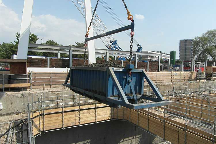 Conquip worked with Dragados Sisk Joint Venture and proposed a new method of spoil removal by combining crane-lifted skips with purpose-designed discharge systems to make a new drop-bottom muck-away skip.