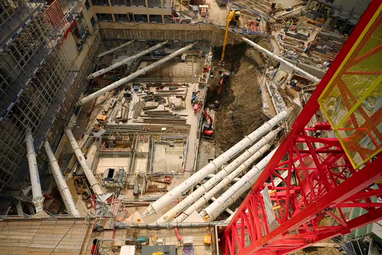 This mixed-use development involves the transformation of the original shopping centre into a London Underground Integrated Ticket Hall (ITH), new retail and leisure facilities, university buildings and residential units. Due to the size of the project, the basement construction methodology is technically complex, so it was an exciting challenge when we were asked to work on the design for the temporary propping.